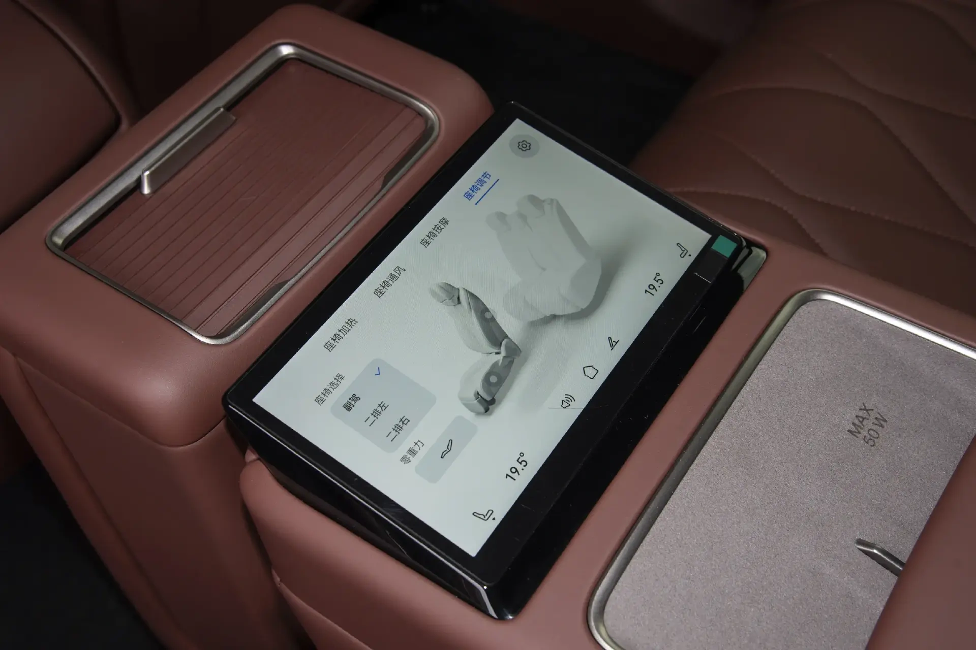 舒适支持方面,昊铂A800除了有支持前排加热/通风/按摩的Nappa真皮座椅外,它的第二排还支持4向电动调节与加热。更重要的是,二排由坐垫+靠背组合而成的后扶手结构可实现整体前移,进而提供储物、触控、无线充电等多项功能,这处设计还是比较创新且具有实用价值的。另外,车辆还提供了冷暖箱、双天窗、翻毛车顶装饰等等。