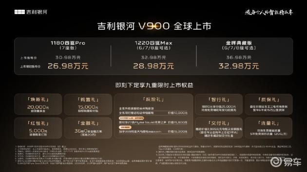 2026年1月20日,吉利银河旗下首款大型豪华mpv——银河V900正式上市。新车共推出3款配置,官方指导价30.98-36.98万元,但推出了极具吸引力的上市限时指导价26.98-32.98万元。
