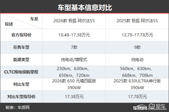 2026款极狐阿尔法S5共推出7款配置,相较2025款车型,虽然配置选择变少,但是价格区间有所下调,性价比更高。动力方面,新款车型在保留纯电版本的基础上,还提供了增程版本可选。本次选择对比的车型均为售价最高的顶配版本,以便能够更加直观地看出两者在配置层面的具体差异。