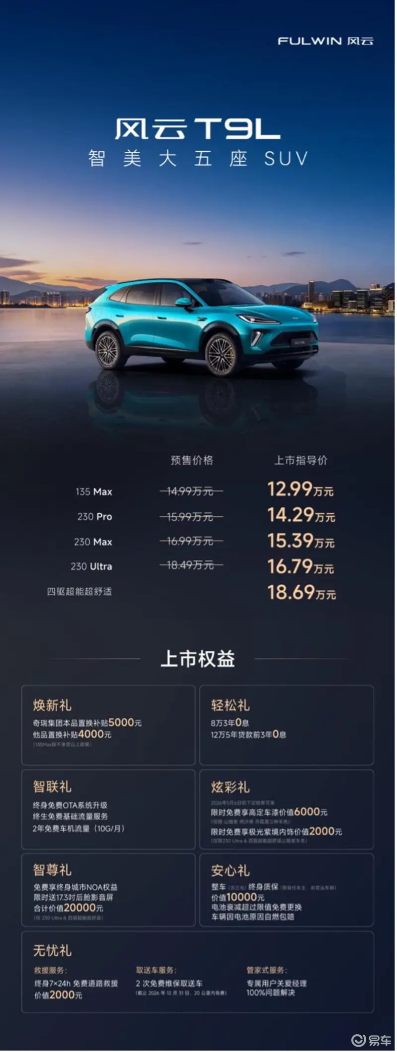 上市多重礼遇,购车无忧从美学设计、空间体验到动力性能、智能安全,风云T9L以全方位越级实力,成为15万级家用中型suv的优选。目前,奇瑞风云T9L已全面到店,欢迎前往全国经销商门店,亲身品鉴这款中式智美混动suv的非凡魅力!