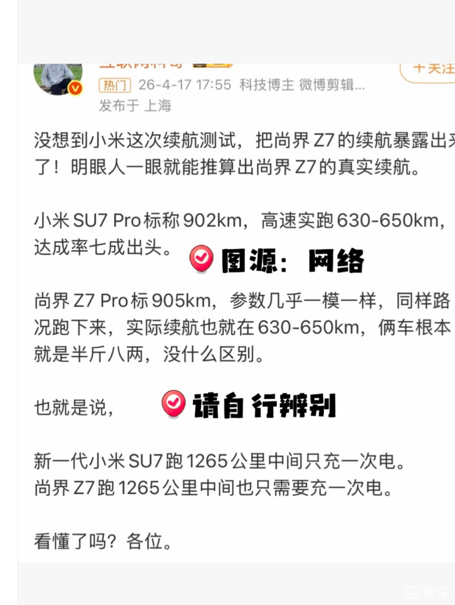 根据网络公开的实测信息可以看到,小米 SU7 Pro 官方标称续航 902 公里,在相同高速路况持续行驶后,实际可行驶里程稳定在 630 至 650 公里区间,整体续航达成率在七成出头。尚界 Z7 Pro 官方标称续航 905 公里,车辆动力、电池规格、车身参数和前者几乎没有差别,在完全一致的行驶路况下,实际高速续航同样落在 630 至 650 公里这个范围。