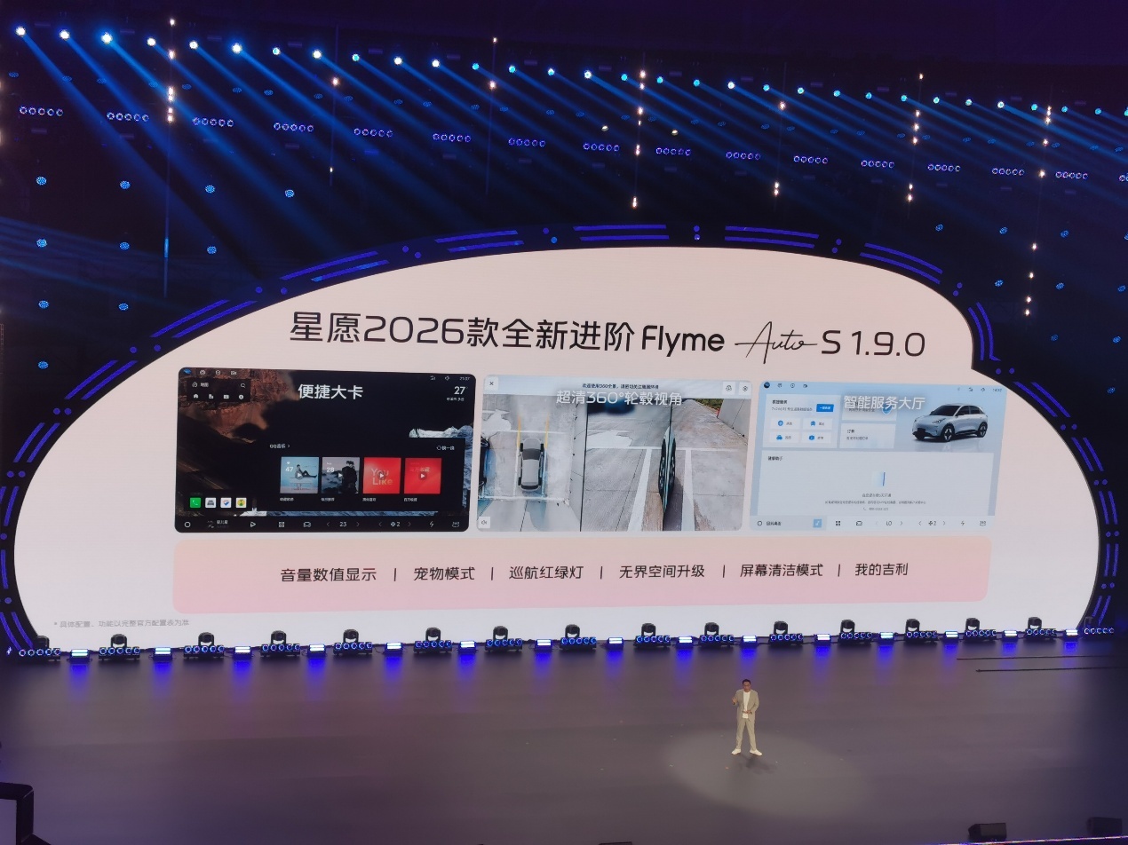 新车提供10.1英寸和14.6英寸两种尺寸的中控屏,搭载银河FlymeAuto智能座舱系统S1.9.0,新增了便捷大卡、360°轮毂视角、智能服务大厅、宠物模式等10项升级功能。车机基于星睿AI大模型与NLP语音交互系统,支持双区语音交互,可实现高频场景免唤醒、深度连续对话、自定义唤醒词、双语对话等功能。手车互联覆盖Flyme Link、Hicar、Carlink等方式。此外,新车还配备车外扬声器、带红绿灯读秒的高德导航,并支持APP远程控车。