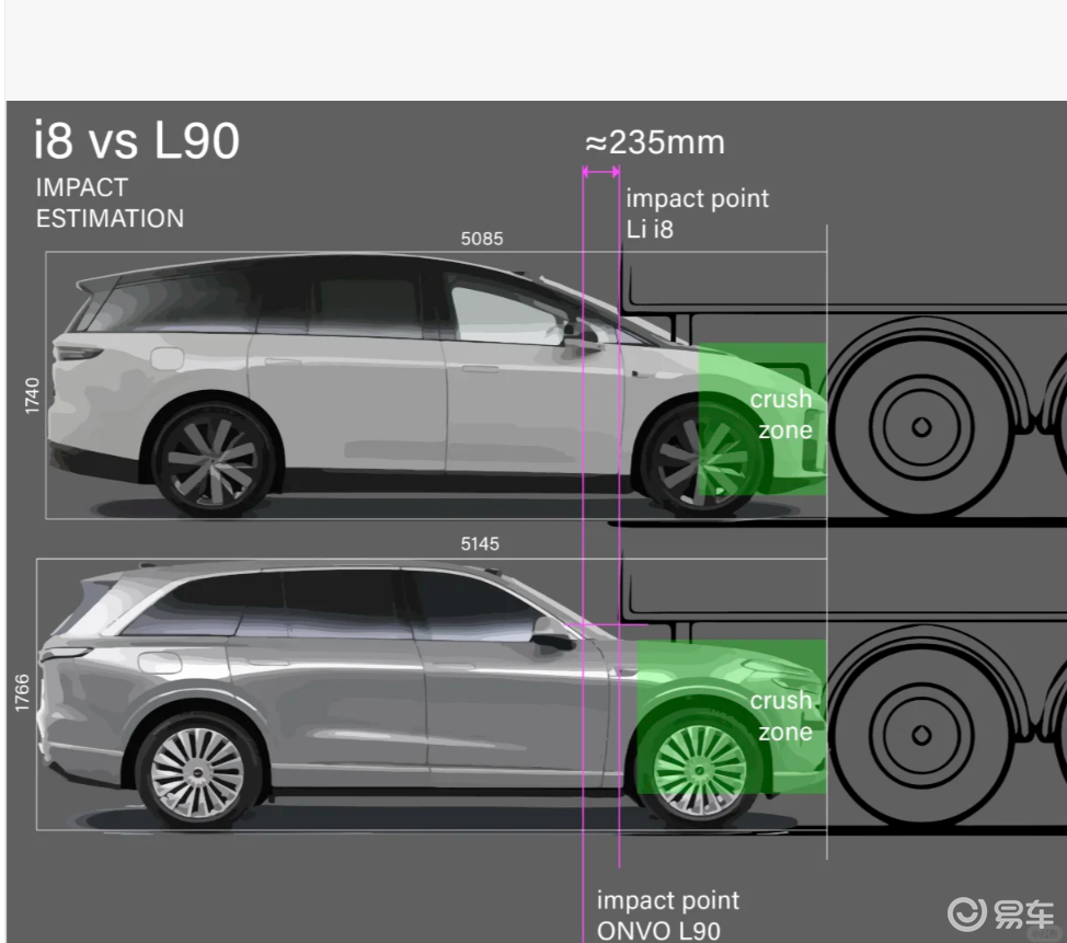 先看懂这张图的核心信息。从标注来看,“crush zone”代表车辆前部的碰撞吸能区域,数值差异理论上反映了车身在碰撞中可形变吸能的空间范围,而冲击点位置则关系到碰撞力是否会过早传递到驾驶舱。有网友结合实际案例解读:“之前理想i8经历过60公里+卡车倒车碰撞测试,A柱没断,现在这张图里吸能区数值更小,说明它可能在设计上更侧重‘硬抗’冲击,减少驾驶舱侵入”;还有人对比56公里钻卡车测试补充:“当时多数suv都没扛住,理想i8能保持A柱完好,确实能说明车身结构有优势”。