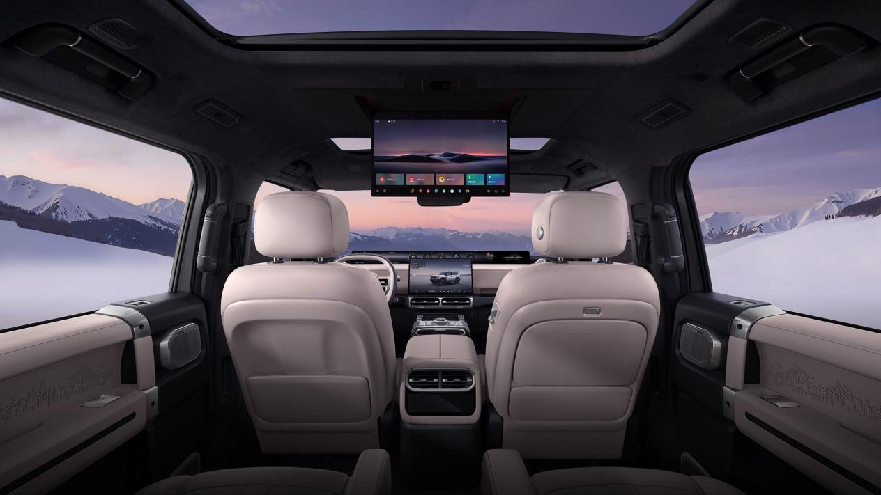 内饰走的是豪华实用路线,整体设计和外观呼应,以方正线条为主。车内用了大面积皮质包裹,还加了镀铬装饰,摸起来、看起来都有质感。最显眼的是中控台那块35.4英寸的贯穿式“天际屏”,分辨率高,就算太阳直射也看得清,还能自定义显示导航、娱乐等信息;旁边还有个15.6英寸的悬浮中控屏,操作起来很顺手。配置上也很贴心,7.1.4哈曼音响系统,峰值功率1500W,听歌像在剧院;AQS空气质量监测加双层流空调,车内空气好还不容易起雾;超大冷暖箱能调-6 到50度,夏天放饮料、冬天热食物都方便;甚至还带了外挂制氧机,去高原开车也不怕缺氧。